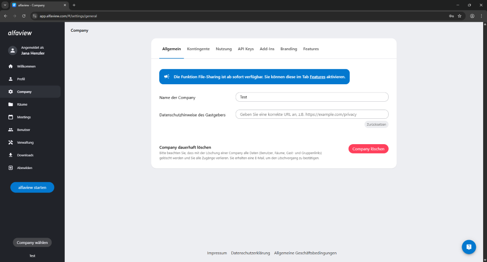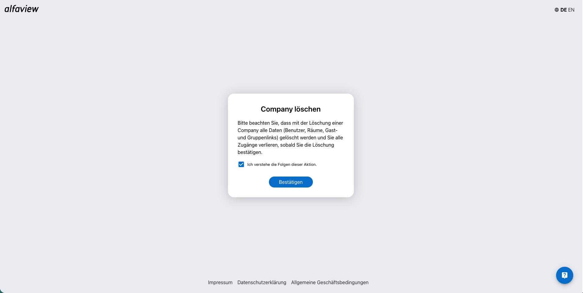 Bitte beachten Sie, dass mit der Löschung einer Company alle Daten (Benutzer, Räume, Gast- und Gruppenlinks) gelöscht werden und Sie alle Zugänge verlieren.