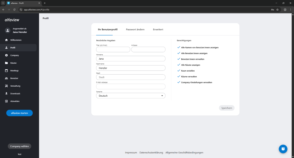 Im Reiter Profil können Sie sehen, welche Benutzerberechtigungen Sie innerhalb Ihrer Company haben. Sie können hier auch Ihre persönlichen Daten anpassen.