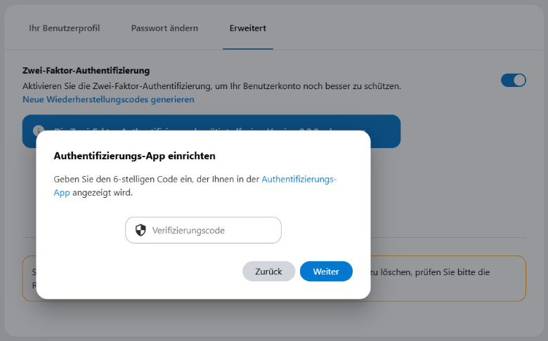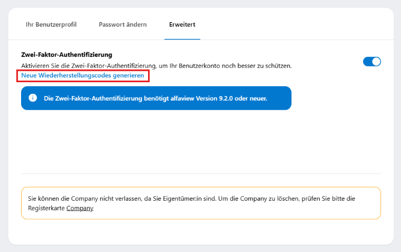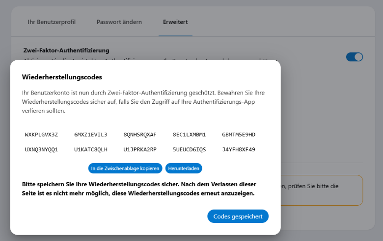 Sie können in den erweiterten Profileinstellungen der Verwaltungsoberfläche neue Wiederherstellungscodes generieren.