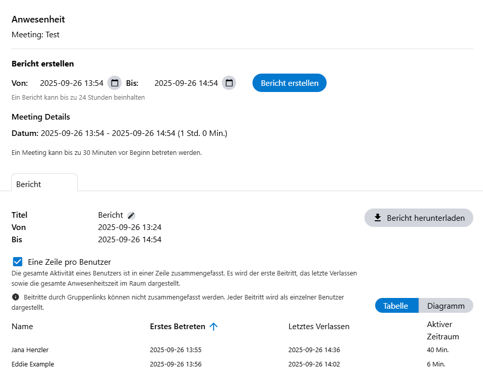 Sie können entscheiden, ob Sie mehrere Eintritte einer einzelnen Person in mehreren Zeilen oder gebündelt in einer Zeile anzeigen lassen möchten. Wenn Sie eine gebündelte Anzeige auswählen, wird Ihnen der erste Beitritt, das letzte Verlassen sowie die gesamte Anwesenheitszeit im Meeting dargestellt.