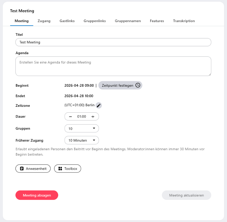 neben dem Meeting in der Raumliste und wählen Sie Meeting bearbeiten. Durch einen Klick auf wird Ihr Meeting gelöscht und alle eingetragenen Teilnehmer:innen werden per E-Mail über die Absage informiert.