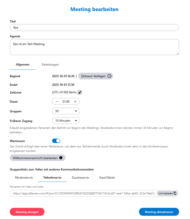 Sie können alle Meetings bearbeiten, die noch nicht begonnen haben. Personalisierte Gastlinks und allgemeine Gruppenlinks können Sie immer erstellen.