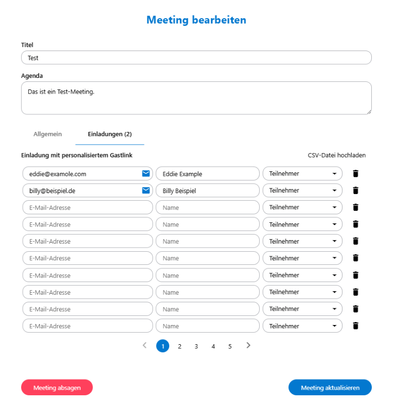 Sie können im Reiter Einladungen personalisierte Einladungen für Ihr Meeting als Gastlinks versenden. Tragen Sie dafür den Namen sowie die E-Mailadresse ein und wählen Sie eine Rolle in der Auswahlliste aus. Wenn Sie gleichzeitig mehrere Personen personalisiert einladen möchten, können Sie auch eine CSV-Datei hochladen.