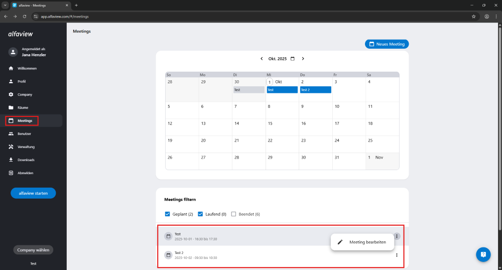 Wählen Sie in der Liste aller Meetings unter dem Kalender das Meeting aus, welches Sie bearbeiten möchten. Alternativ können Sie die Meetingliste filtern.