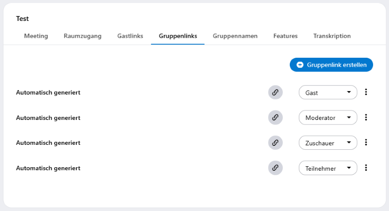 Im Reiter Allgemein finden Sie im unteren Bereich die Gruppenlinks, die nach Nutzerrollen sortiert sind. Kopieren Sie einen Link mit der gewünschten Berechtigung durch einen Klick auf die graue Schaltfläche . Sie können diesen Link nun über Ihr bevorzugtes Kommunikationsmedium an Teilnehmer:innen versenden.
