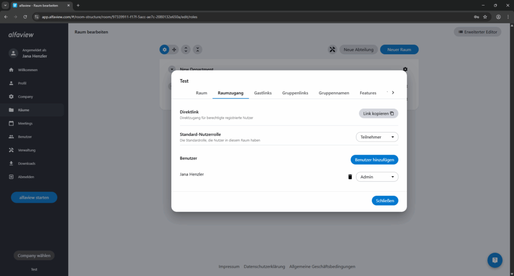 Im Reiter Raumzugang können Sie auf den Direktlink zugreifen, die Standard-Nutzerrolle anpassen sowie Benutzer:innen Ihrer Company zum Raum hinzufügen.