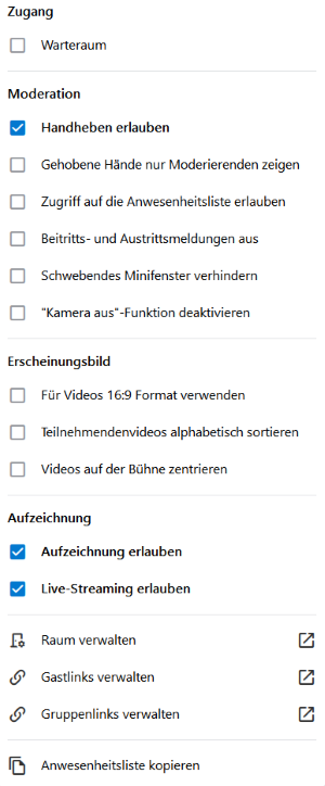 Host-Tools im Statusmenü unten links. - Setzen Sie nun Häkchen vor alle Raum-Features, die Sie für den Raum aktivieren möchten.