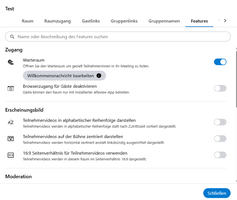 Die Features sind in die vier Kategorien Zugang, Erscheinungsbild, Moderation und Aufzeichnung unterteilt. Nutzen Sie die Suchleiste, um einzelne Features zu finden.