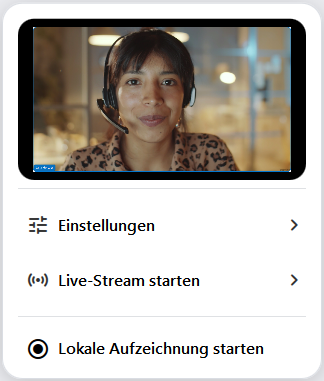 Um Ihr alfaview-Video direkt auf eine Streamingplattform zu übertragen, klicken Sie auf Aufzeichnung & Streaming im Statusmenü. Es öffnet sich ein Auswahlfenster, in dem Sie Einstellungen vornehmen sowie wählen können, ob eine lokale Aufzeichnung oder ein Stream gestartet werden soll.