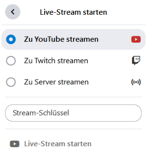 Live-Stream starten. - Wählen Sie aus, zu welcher Plattform Sie streamen wollen.