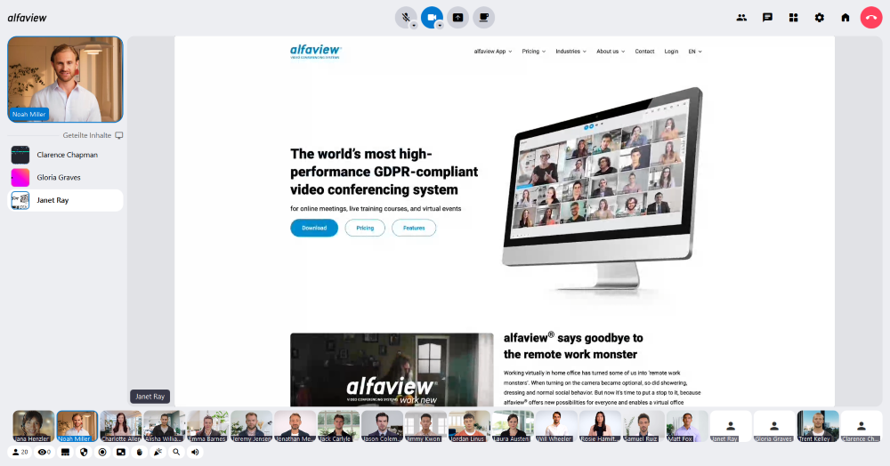 - Jede:r Teilnehmende kann individuell entscheiden, welche Bildschirmübertragung groß dargestellt werden soll.