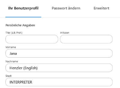 - Tragen Sie im Reiter Ihr Benutzerprofil das Wort „INTERPRETER“ in Blockbuchstaben in das Eingabefeld unter „Stadt“ ein. Achten Sie auf eine korrekte Schreibweise.