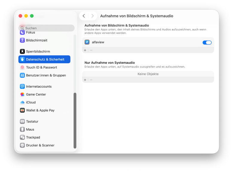 - Für eine Bildschirmübertragung auf einem Apple macOS-Gerät müssen zusätzliche Berechtigungen erteilt werden. Sie finden weitere Informationen und eine Anleitung zur Berechtigungsfreigabe auf der Seite Hinweise zum Webclient von alfaview.