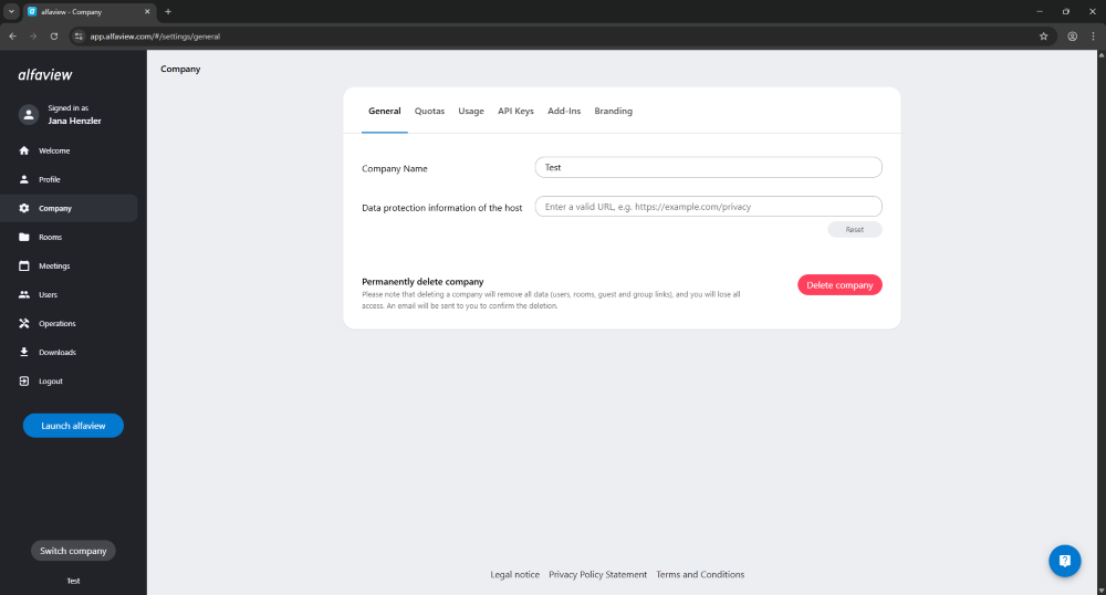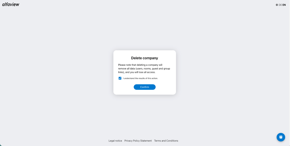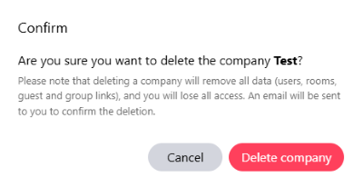 Please note that deleting a company will remove all data (users, rooms, guest and group links), and you will lose all access.