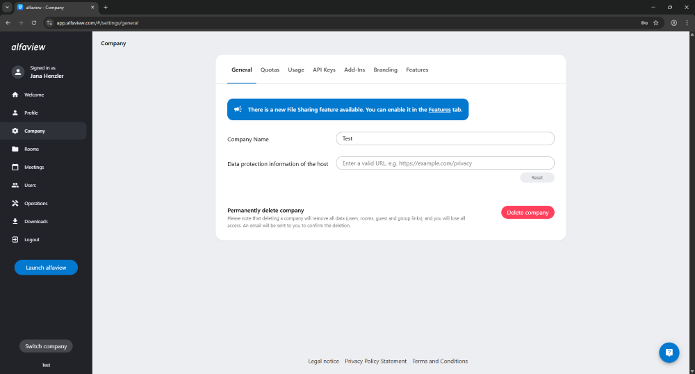 Please note that deleting a company will remove all data (users, rooms, guest and group links), and you will lose all access.
