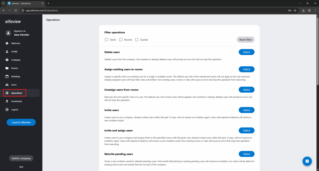 You can filter the operations by users, rooms and guests by clicking in the respective boxes. Select the operation you want to apply by clicking on the button. Enter the data in the form as described to perform the operation.