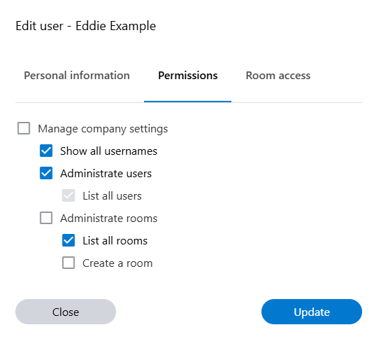 List all users | Users with this permission can access the Users tab in the administration interface, which displays all current and pending users. This permission makes it easier for room administrators to grant users access to a room. |