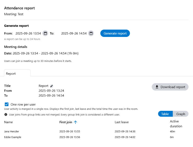 You can decide whether you want to display multiple entries from a single user in multiple rows or bundled together in one row. If you select a bundled display, the first meeting entry, the last meeting exit and the total time spent in the meeting will be displayed.