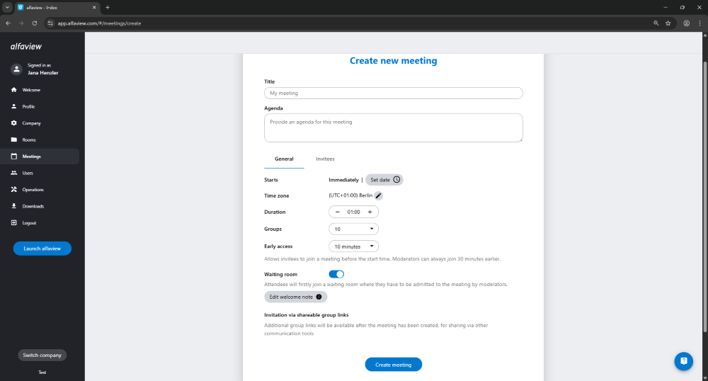 If you do not change the starting time and date, the meeting will start immediately after being created. This also means that you won’t be able to make any changes after creating the meeting.