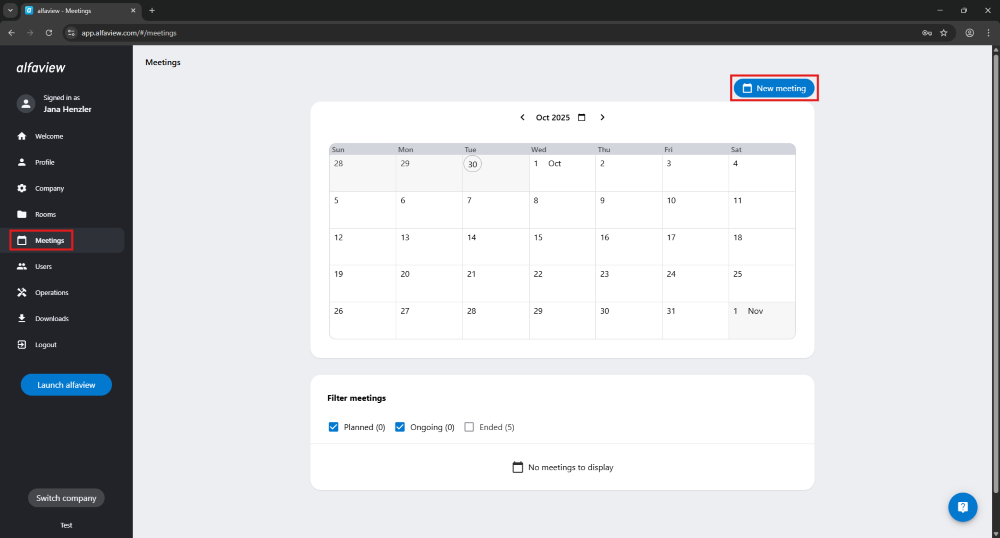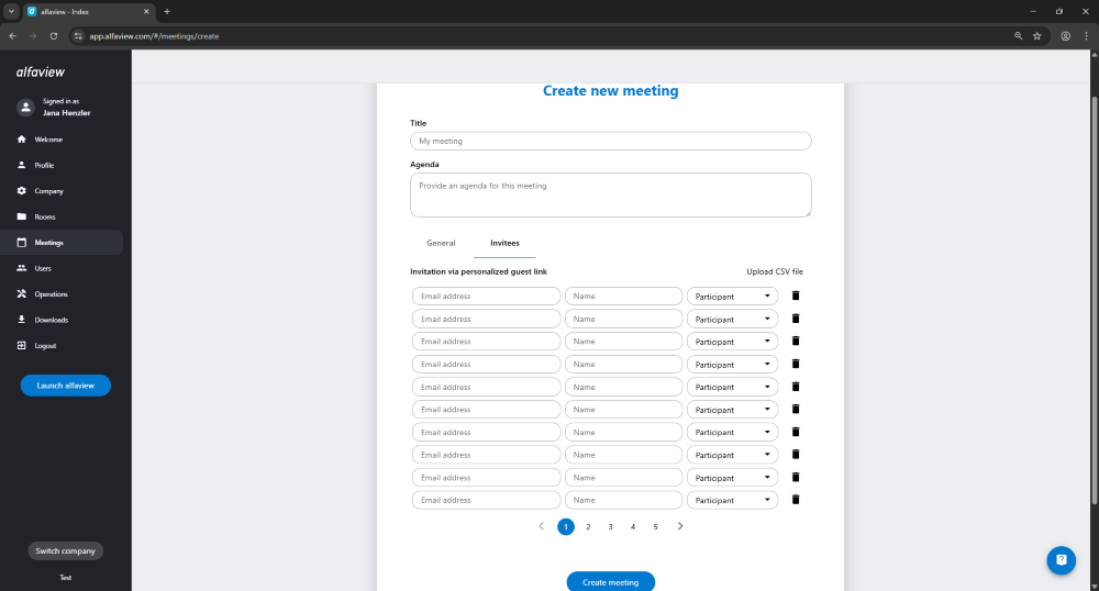 Meetings are personal and time-limited rooms that all registered users can use to start a personal video conference. No special permissions are required to create a meeting. Each temporary meeting has its own title and agenda. Meetings are automatically deleted after they have been held and are no longer accessible.