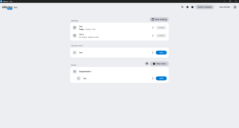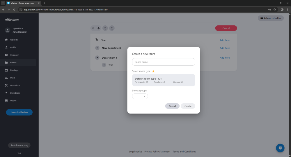 To create a new room, please click on the menu item Rooms in the menu on the left of the administration interface. Alternatively, you can click on on the alfaview app’s landing page to open the room management directly.