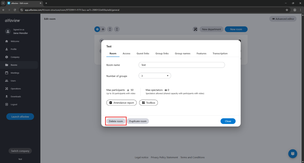 - Click on the menu item Rooms in the menu on the left of the administration interface.