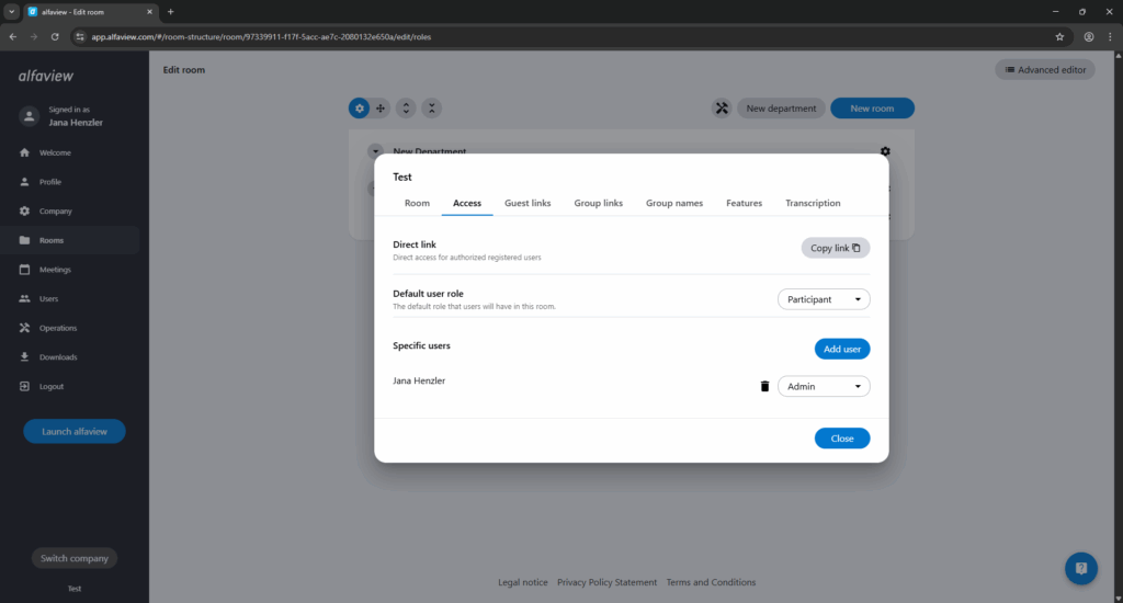 The Access tab allows you to access the direct link, modify the default user role and add users from your company to the room.