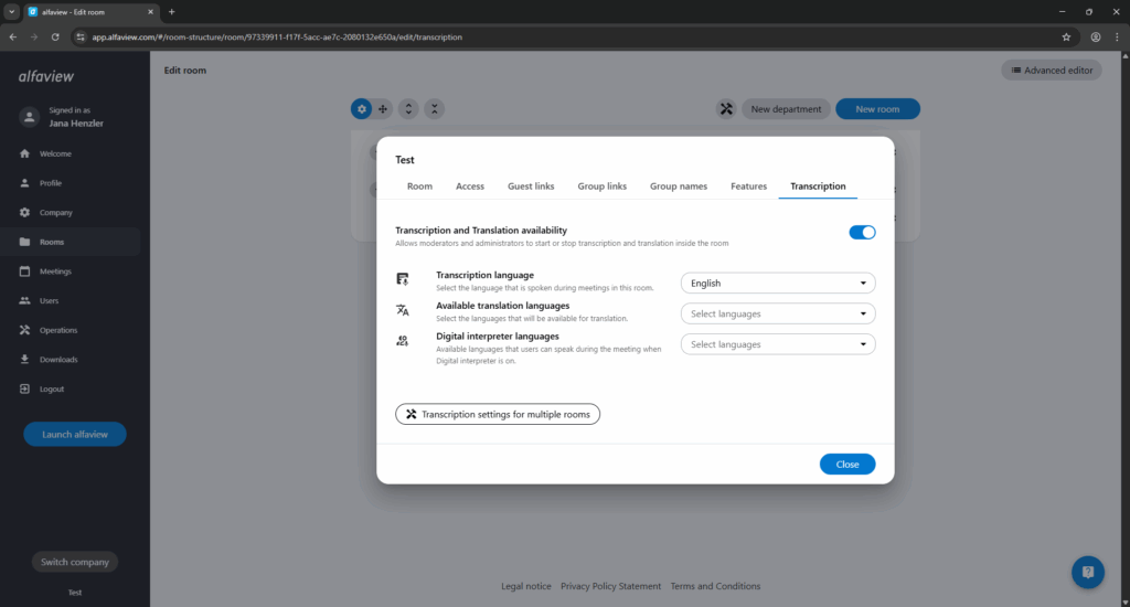 If you want to activate the live transcription feature in your alfaview room, follow the instructions on the Live Transcription and Translation page.