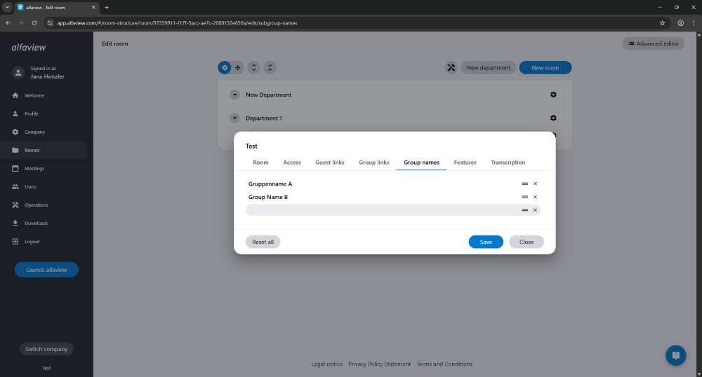 Customize your alfaview rooms with room features. You can set your room display preferences, such as alphabetical sorting of participants or displaying all videos in 16:9 aspect ratio. Help your moderators manage the room more easily by enabling the Raise Hand or Copy Attendance List features, or allow recording and live streaming in the room.