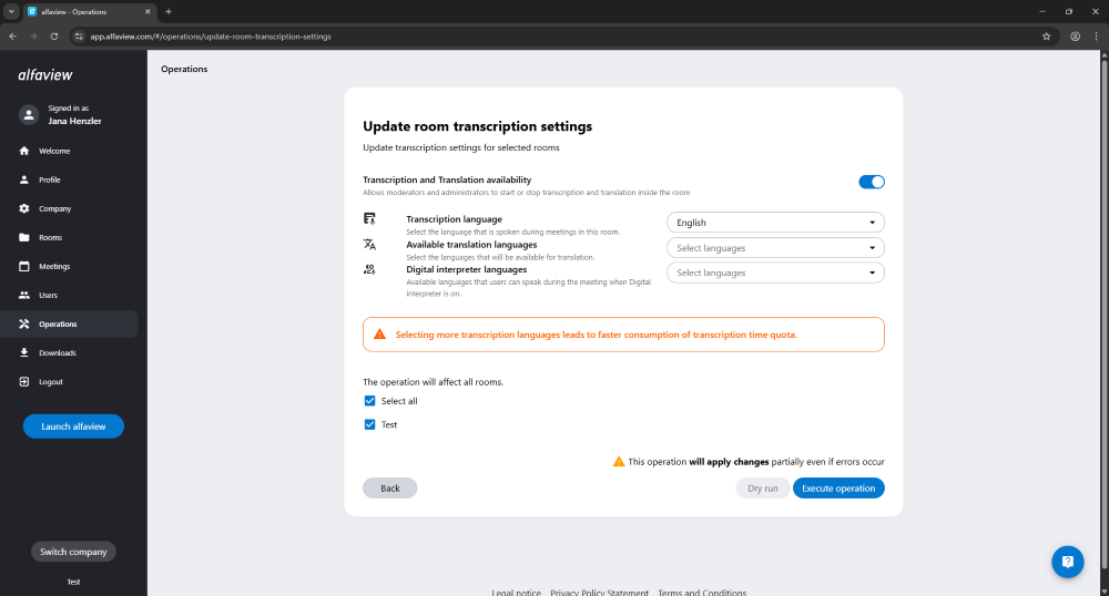 The room language and translation languages can be selected by all room administrators who have room admin permissions for the specific alfaview room.