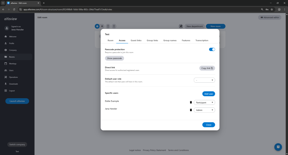 All users who have access to the selected room and who are members of your company can enter the room via the direct link. The user skips the start page and enters the room directly.