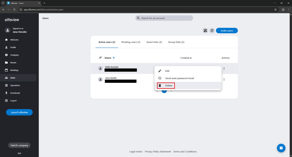 Depending on the permissions, you can delete a user. To delete a user, proceed as follows: