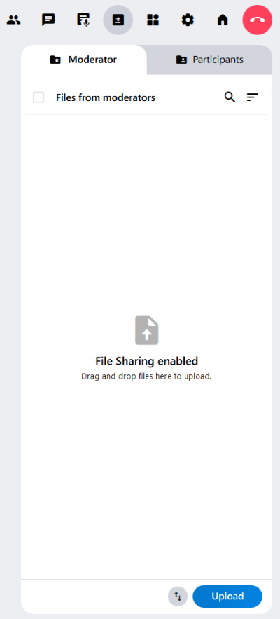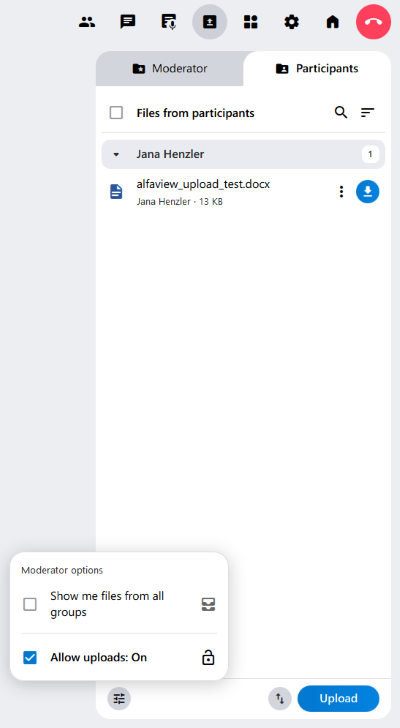 - Allow uploads: Here, the moderator can enable and disable file uploads by participants. If the permission has been revoked, the message “Participant uploads are disabled” appears in the Participants tab.