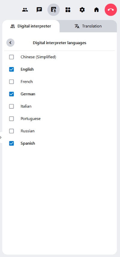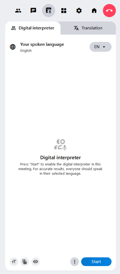 The Digital Interpreter helps participants who speak different languages to communicate with each other. All participants decide for themselves which language they speak. The digital interpreter automatically translates what is said into the chosen language.
