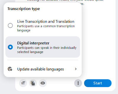 Transcription options icon next to in the Digital Interpreter tab. - Click on Update available languages.