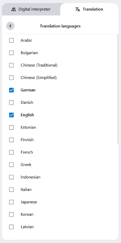As a room administrator, you can select up to three translation languages at the same time. These languages will be available for all participants in your room.