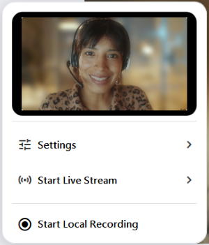 To start a recording or stream, click on the Recording & Streaming icon in the status menu. A selection window will open where you can configure settings and choose whether to start a Local Recording or a Live Stream.