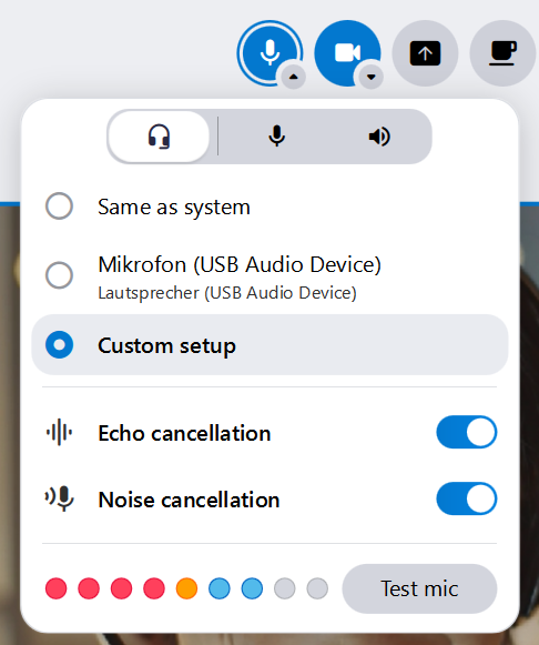 Additional audio settings, such as Noise suppression or Microphone optimization, are available in the Advanced settings.