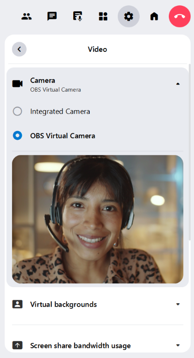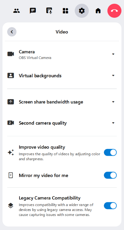 The Settings tab provides various options for your video and camera settings. You can select your preferred camera, virtual backgrounds and the quality of your second camera.