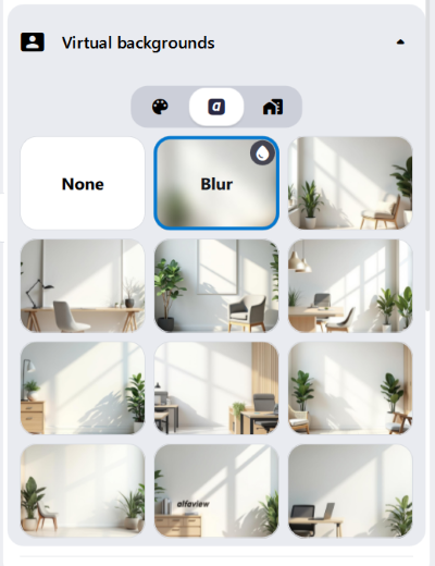 You can blur your background in the Standard backgrounds tab. To do this, click on the Blur preview image. Click on the Blur strength icon in the top right corner of the preview image to open the menu. Select your preferred blur level.