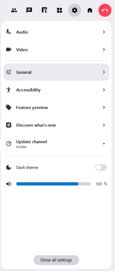 The Settings can be found in the secondary menu. Here you can change your audio and video settings. In addition, you can adjust accessibility settings and find out about the latest updates. Further settings can be found on the General settings page.