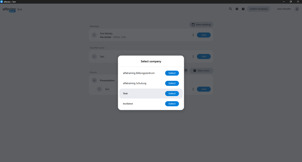 • A dialogue with all available alfaview companies will open. Select the company you want to switch to from the list.