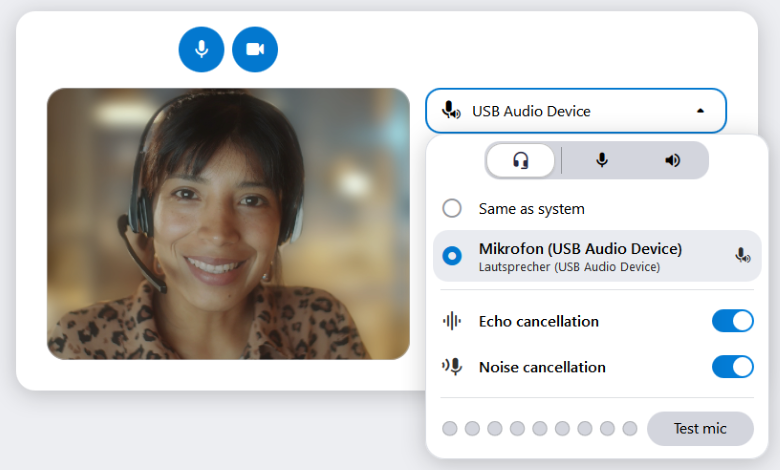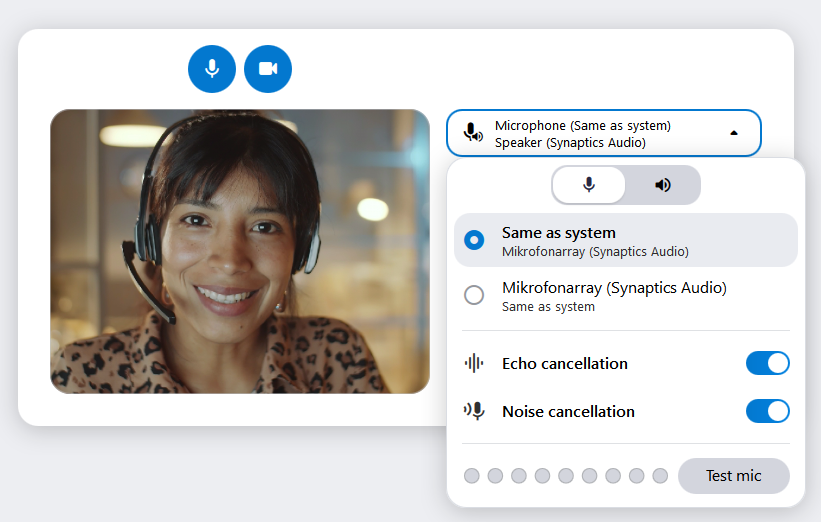Tip: Click the small Drop-down menu icon in the bottom right corner of the Microphone icon to quickly access your advanced audio settings. Select your preferred microphone, speaker or communication device, and enable or disable Echo cancellation and Noise reduction.