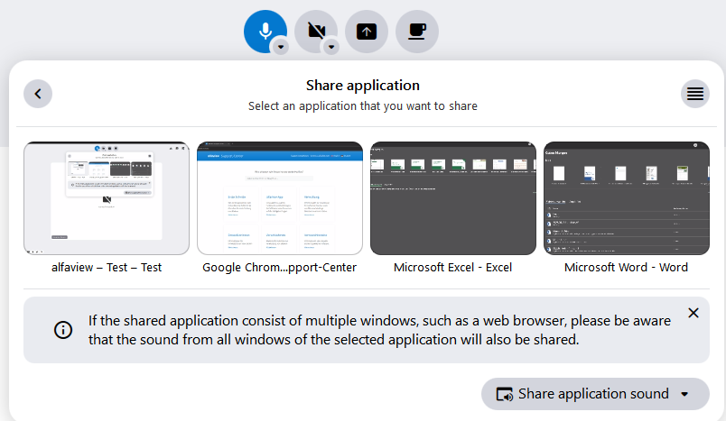 The Share content feature allows you to share your entire screen, a screen region of your screen or an application with others in the alfaview room. You can also share video from a second camera.