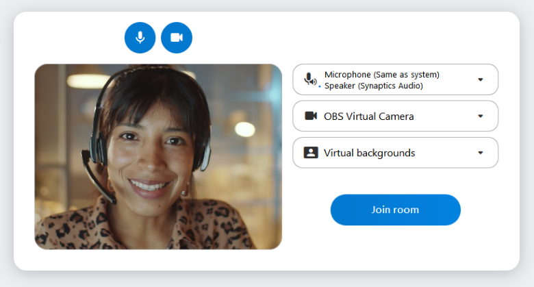 - Click on the drop-down menu with the microphone icon and the name of the preselected audio device. The menu is divided into three tabs: Headset, Microphone and Speaker.
