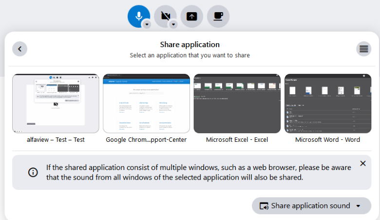 The Share content feature allows you to share your entire screen, a screen region or an application with others in the alfaview room. You can also share the video from a second camera.