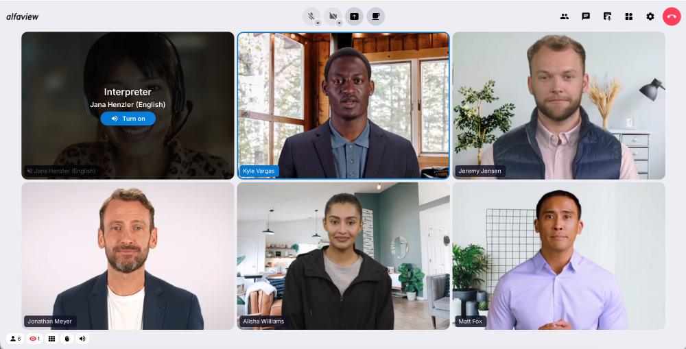 The interpreter will be displayed next to the VIPs in the alfaview room and the participants decide whether they want to listen to the original audio or the interpreted version. If the participants activate the simultaneous interpreting function, the volume of the presenting speaker is reduced and the interpreter can be heard louder.