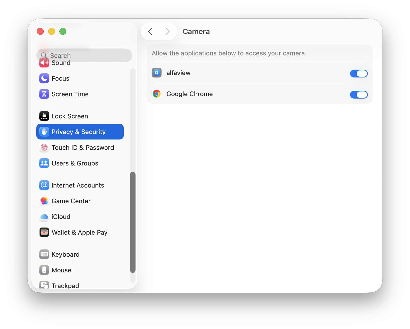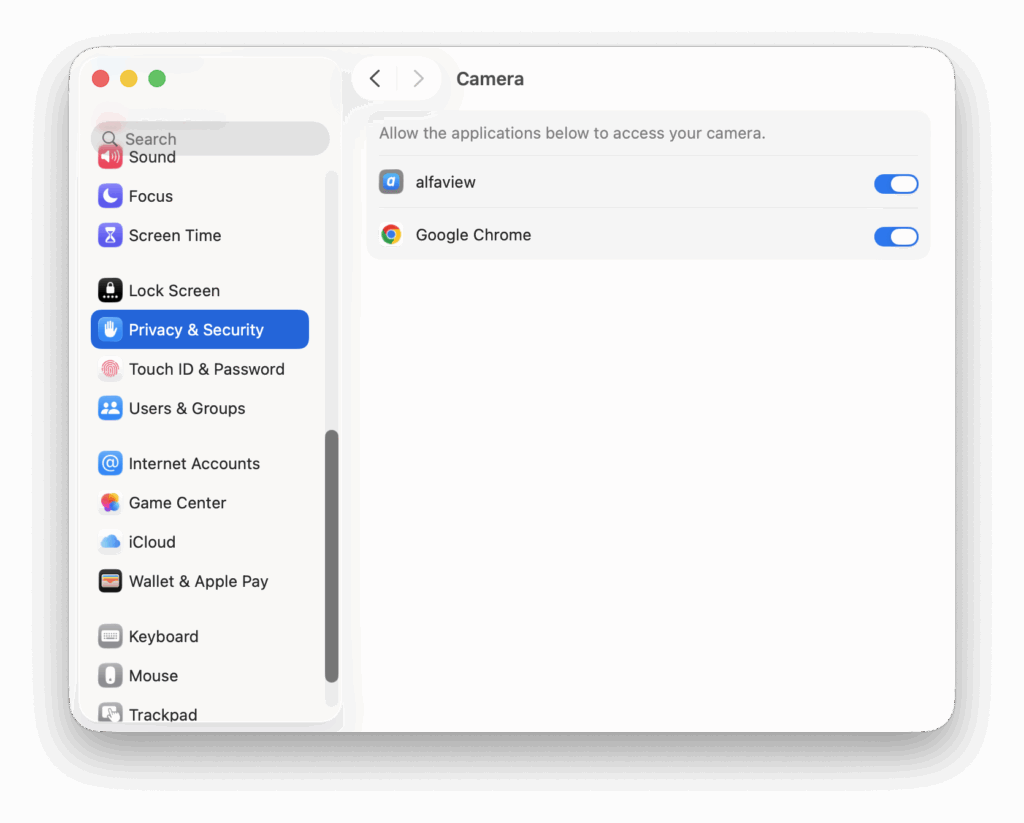 • To prevent access to the camera or microphone, the checkbox next to the icon of your preferred browser icon must be disabled.