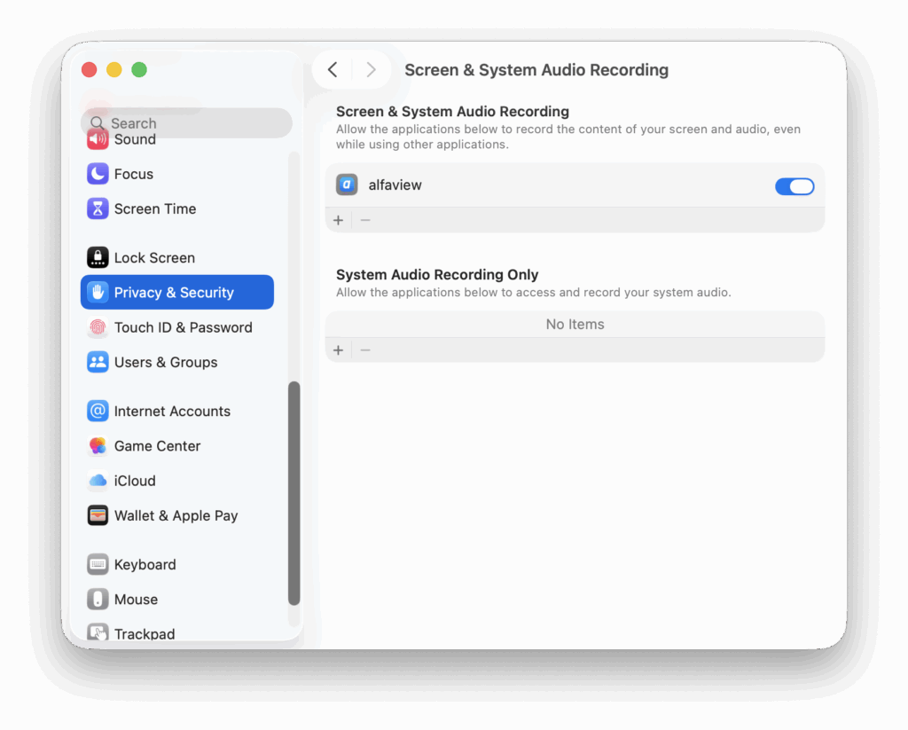 • Additional permissions are required for screen share on Apple macOS devices. For more information and a guide on enabling permissions, please refer to the page Notes on the browser version of alfaview.